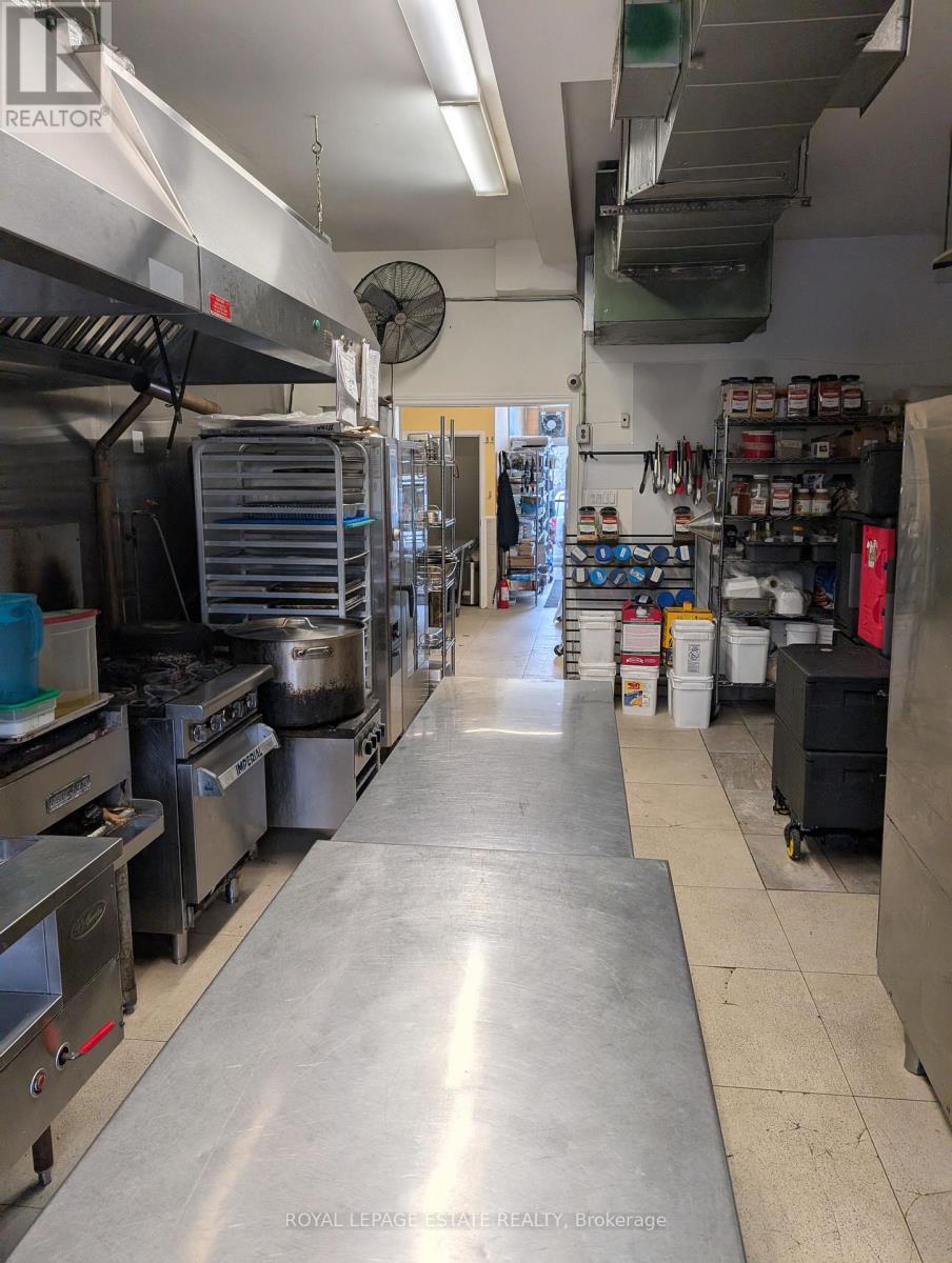 8 parking spaces, 600V 3-phase electrical, improved water intake, corner exposure and a well designed commercial kitchen make this building a caterers dream. Imagine the ease of delivery from this well located kitchen, right between the suburbs and downtown, with instant access to the DVP. Your large 10-foot commercial hood clears the air from your busy burners, cooking the food prepared at any one of your 5 prep areas and kept fresh in your 200 square foot walk-in freezer and fridges. Suitable for caterers, ghost kitchens or commissary kitchens, this location comes equipped with an operating hood (10 feet wide), gas connections for burners or fryers of any kind, sinks and sink rough-ins throughout the property, five prep areas, a 100 square foot walk-in freezer and a 100-square foot walk-in fridge (both working well), ample storage, washrooms and office space. The high ceilings on both the main and lower levels make the space appealing, bright and easily ventilated for busy shifts and productive employees. The commercial kitchen is to operate at $6000 per month NET, plus Additional Rent (TMI). The corner property is well exposed to drive-by traffic so that any business will be recognized and easily found by buying customers. Ample electrical supply (600v 3-phase 4-wire 100 amp) and water supply (3/4 inch supply from city) make the juice worth the squeeze. Separate gas and hydro meters ensure you only pay for your own utilities. 2 1/2 storey south facing brick wall would make for a wonderful mural. Any destination business tenant will be recognizable for miles around. (id:62692)