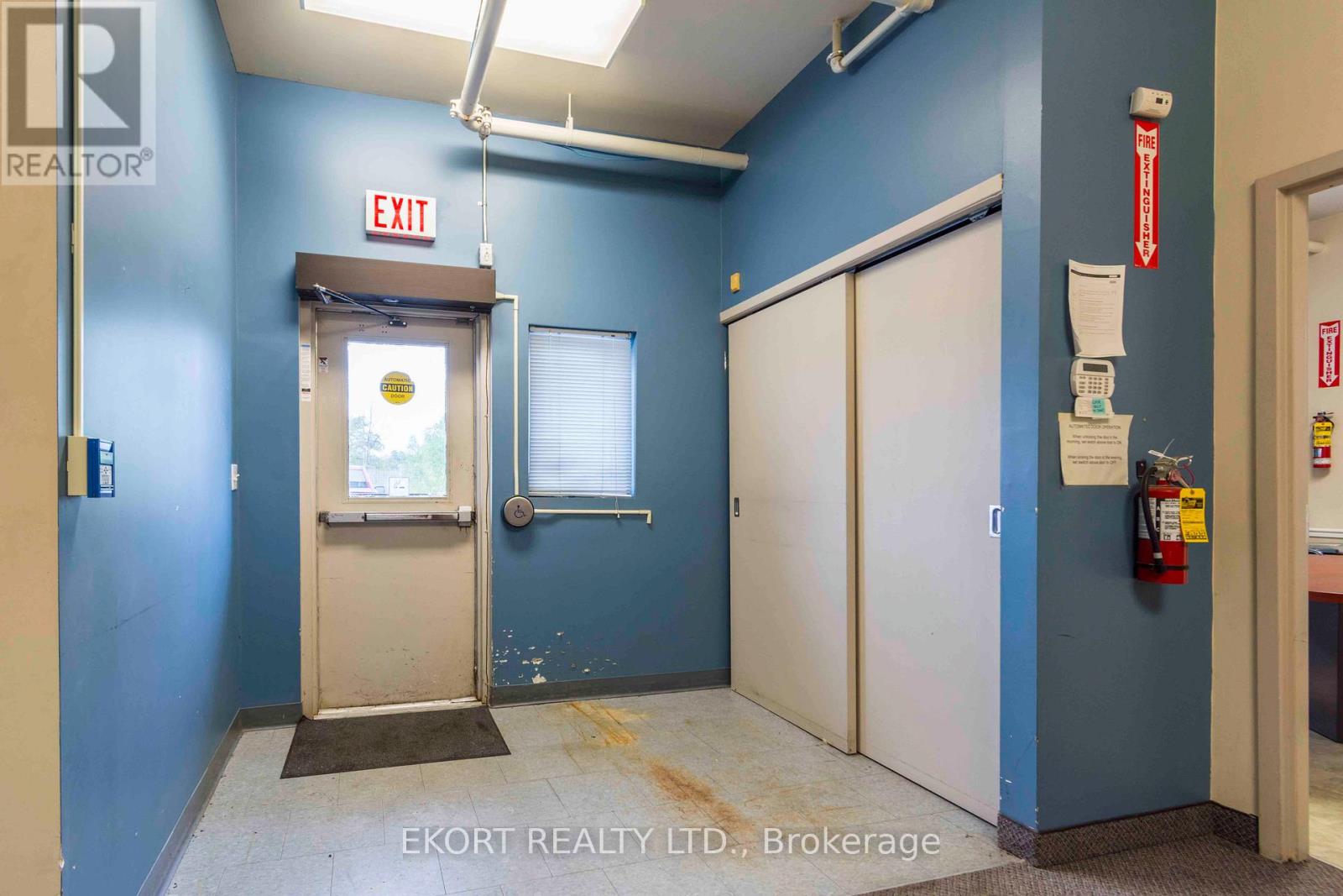 The subject site is developed with a 23,757 square foot industrial building constructed in stages between 1990 and 2007. Gross floor area of the building is as follows: Industrial Space 21,118 Sq. Ft. Office 2,639 Sq. Ft. Total 23,757 Sq. Ft. The building is a prefabricated steel frame structure on a poured concrete foundation. The exterior is clad in steel and the roof is steel. The office pod is situated along the east side of the building, fronting onto West Street. It consists of a reception area, two private offices, a board room, two staff washrooms and a kitchenette. In addition, there is a separate shop office that includes office space, a lunchroom, and men's and women's locker rooms and washrooms. The industrial portion has a clear height of 26 feet. It is demised into two areas, including the dumping area and the sorting area. The dumping area has a lower floor than the sorting area. It is equipped with conveyor belts that lead to the sorting floor. There are two curtain doors to the west side of the building, both of which are approximately 22 feet in height. The sorting area has three dock-high loading doors with levellers, as well as a grade level door. The doors all lead to the west side of the building. The industrial area is unheated with no ceiling or wall finishes. The electrical service is 400 Amp, 600 volt, 3-phase with a transformer. The office pod is heated by a gas fired furnace with central air conditioning. The building is somewhat specialized for its current use (recycling sorting facility) but would suit a variety of similar manufacturing or laboratory uses. (id:62692)