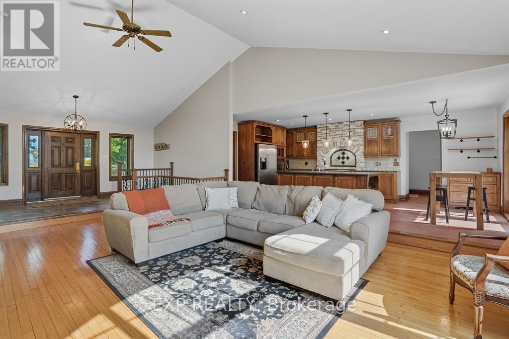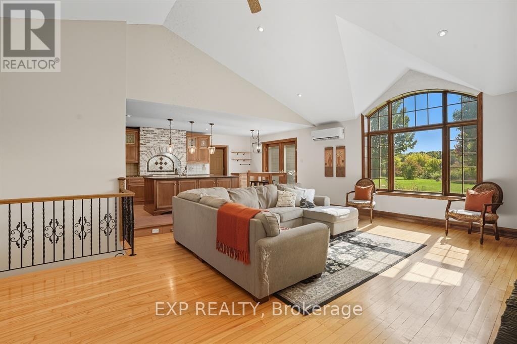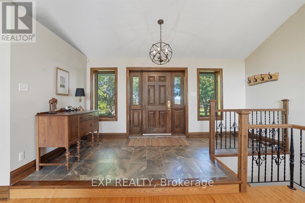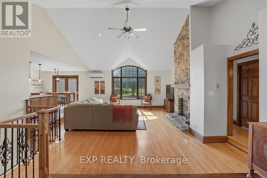 Experience an unparalleled rural lifestyle on this breathtaking (approx) 49.5-acre hobby farm, anchored by a custom-built ICF (Insulated Concrete Form) bungalow offering over 2,200 sq. ft. of high-efficiency luxury. Designed for the discerning buyer, the residence features a sophisticated open-concept floor plan with soaring cathedral ceilings and a magnificent floor-to-ceiling stone gas fireplace. The chef-inspired kitchen is a true centerpiece, boasting premium granite counters, built-in appliances, and a massive social island perfect for entertaining. The home offers three spacious bedrooms, including a primary retreat with a walk-in closet and a brand-new contemporary tiled shower. The expansive lower level provides incredible expansion potential with 9-foot ceilings, a secondary wood-burning stone fireplace, and a full bathroom rough-in-ideal for a home gym or additional guest suites. Enjoy the consistent comfort of radiant floor heating throughout both levels and the cooling of a wall-mounted A/C unit. The diverse grounds are a perfect blend of productive tillable land, fenced pastures, and mature woods with private trails. Equestrian enthusiasts will appreciate the turnkey 8-stall barn equipped with hydro, water, and a substantial hay loft. Complete with a double attached garage and unparalleled privacy, this rare (Approx.) 49.5-acre sanctuary offers a seamless fusion of modern structural integrity and peaceful country living. Book your private viewing today to experience this one-of-a-kind homestead. (id:62692)