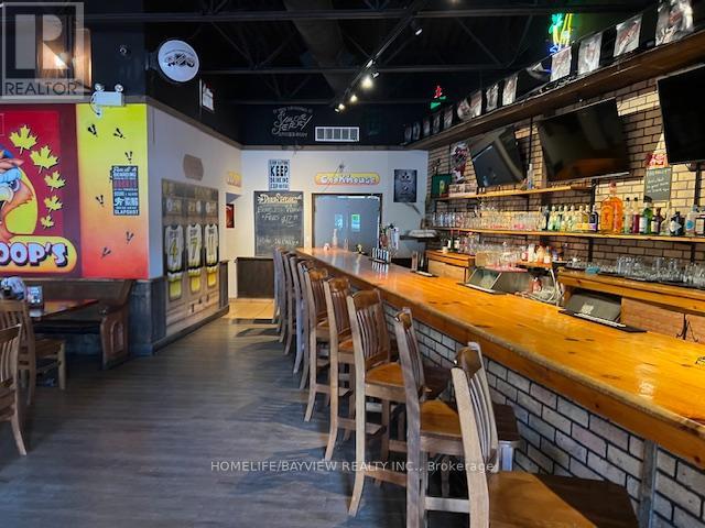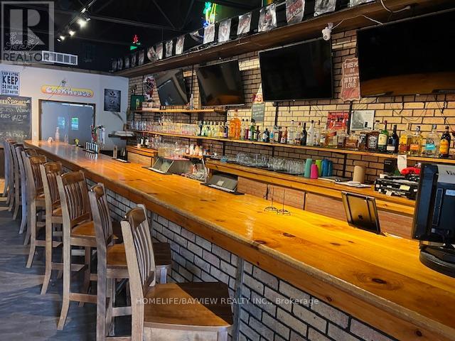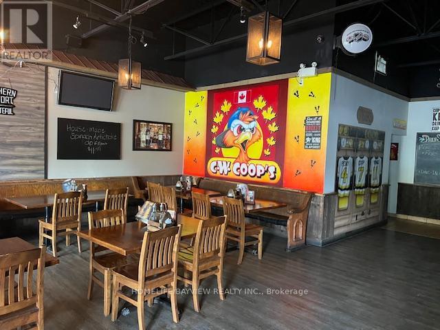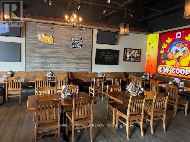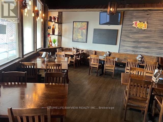 Established and busy bar and grill serving best-tasting homemade fresh foods. Full bar with L.L.B.O. with 40 seats plus huge patio. Lots of loyal customers with long-standing brand name. Prime location in very busy plaza in between Shoppers Drug Mart & Royal Bank. Extra-large basement for storage – lots of potential to use for banquet, parties, or billiards/gaming. Full grill kitchen with exhaust hood, large walk-in cooler, prep tables, freezers, etc. Don’t miss this amazing opportunity. Potential to open for breakfast & lunch (currently only open for Dinner daily). Sales $6,000/Week. Rent $6100/Month includes TMI, HST, & water. Long lease 5 years + 5 years option to renew starting in January 2026. Be discreet – do not talk to staff or customers. Owner willing to train buyers. (id:62692)