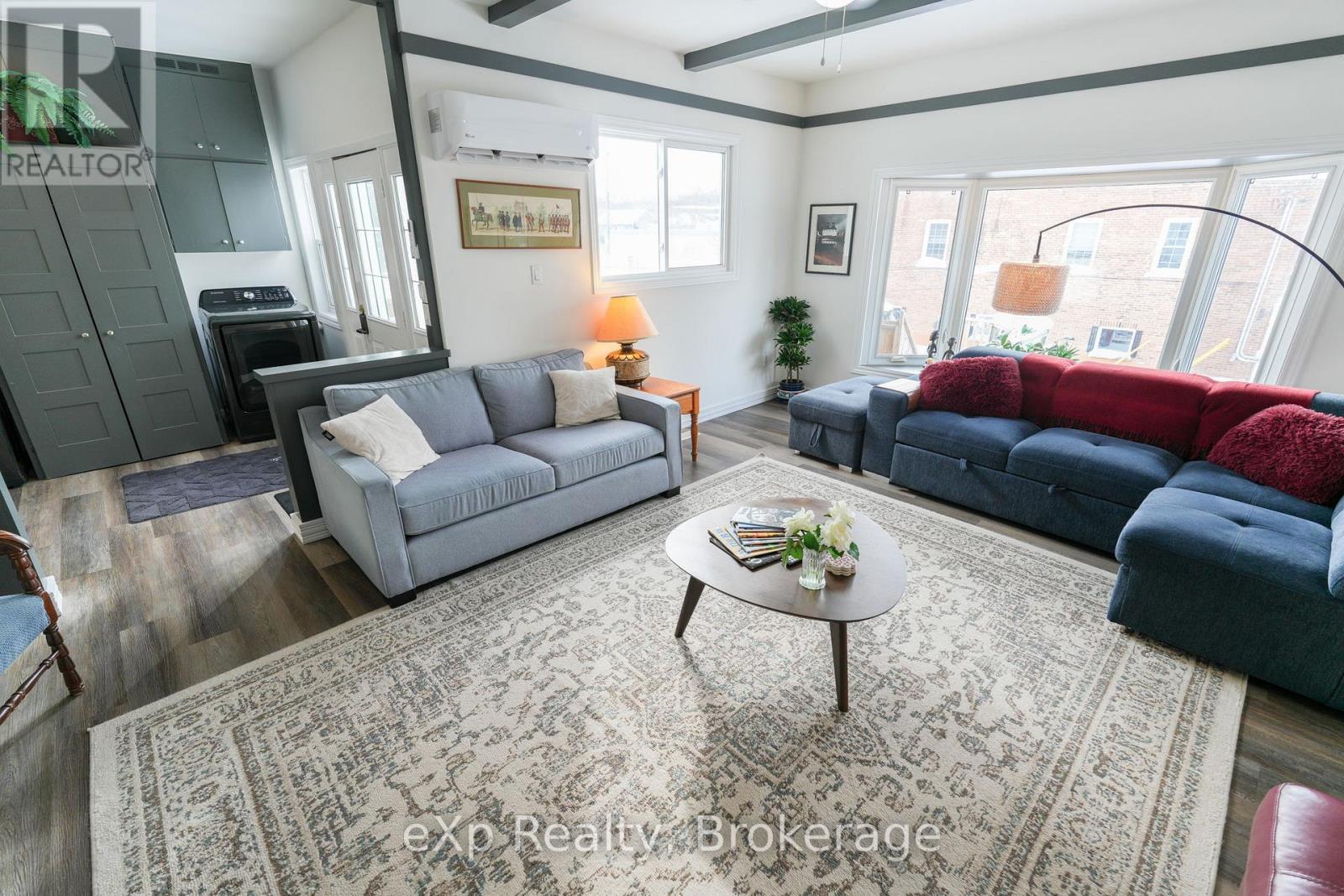 Right in the historic downtown core, this spacious second-floor commercial space puts your business at the centre of everything that makes Meaford tick - and within easy reach of the broader region.The location works hard for you. A block from the marina and Georgian Bay, across from Meaford Hall, and kitty-corner to the town's striking new public library. Independent shops, great restaurants, and a genuinely walkable streetscape are all steps away - the kind of setting that makes client visits easy and lunch breaks worth taking. Thornbury, Collingwood, and Owen Sound are all a short drive when the day calls for it. At over 1,440 square feet, the space is larger and more versatile than most in this market. Currently configured for residential use - with a bay-windowed front room, a generous open area, a functional kitchen with eat-at bar, two full bathrooms, and private laundry - it transitions readily to a range of professional uses. Zoned commercial, it suits a design studio, wellness practice, legal or financial office, or any business that values a polished, well-finished environment.Two private entrances, front and back, give the space a clean operational flow - useful for separating client-facing and staff access. A large rear deck adds an outdoor element that few commercial spaces in the area can offer. (id:62692)
