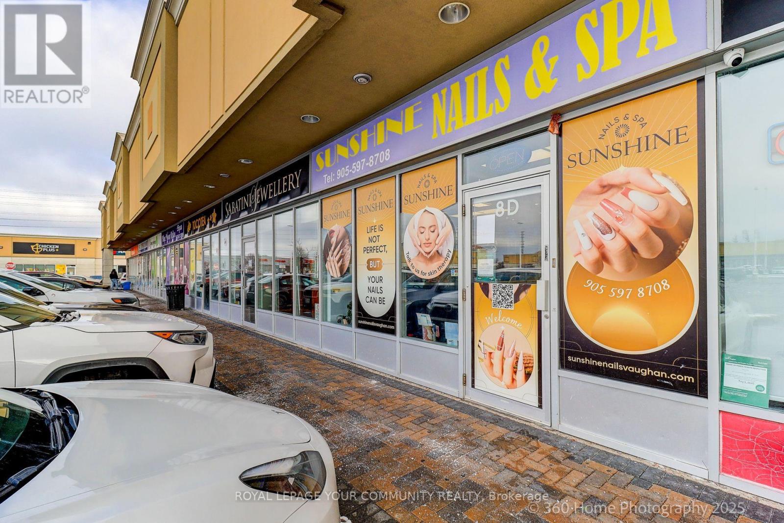 Look No Further!!! Busy Nail/Beauty Salon close to Vaughan Mills Mall. Located in High Traffic Plaza, fronting Rutherford Rd, Close to Major Highway. 1280 Sq Ft includes 9 Nail Stations, Tables, Chairs, 7 Foot Spas/Lounges and Chairs, 3 Private Rooms for Aesthetics, Waxing, Massages, etc etc etc. Washer/Dryer, Fridge, Linens, All Products and Equipment Supplies. Established Business with an established list of Clientele. Open 7 days a week. Parking Outdoors. A Must See!!! Bring an Offer!! (id:62692)